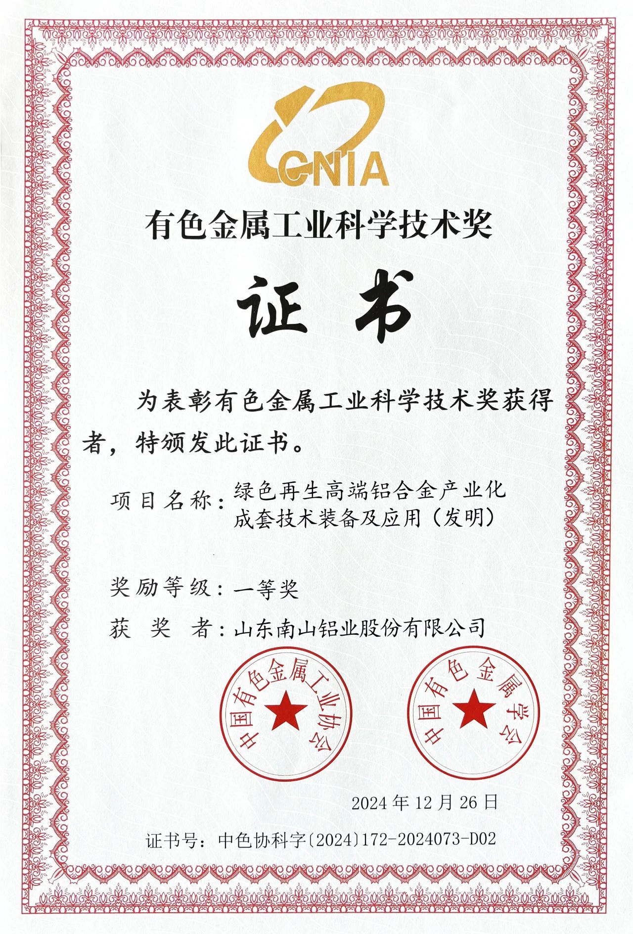 南山鋁業(yè)與北京科技大學聯合申報的《綠色再生高端鋁合金產業(yè)化成套技術裝備及應用》項目榮獲技術發(fā)明一等獎。