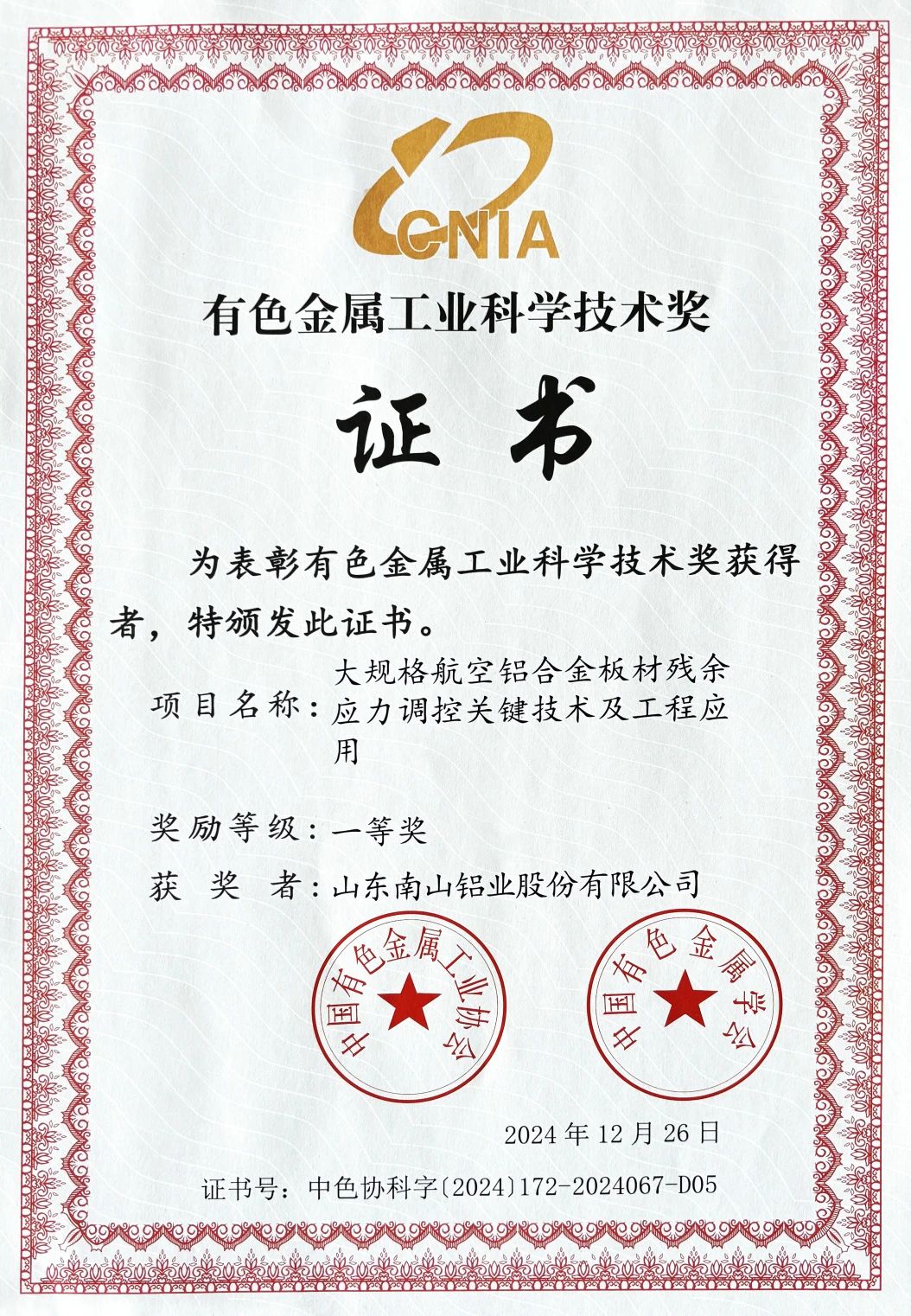 南山鋁業(yè)與有研工程技術研究院有限公司聯合申報的《大規(guī)格航空鋁合金板材殘余應力調控關鍵技術及工程應用》項目榮獲科學技術一等獎。