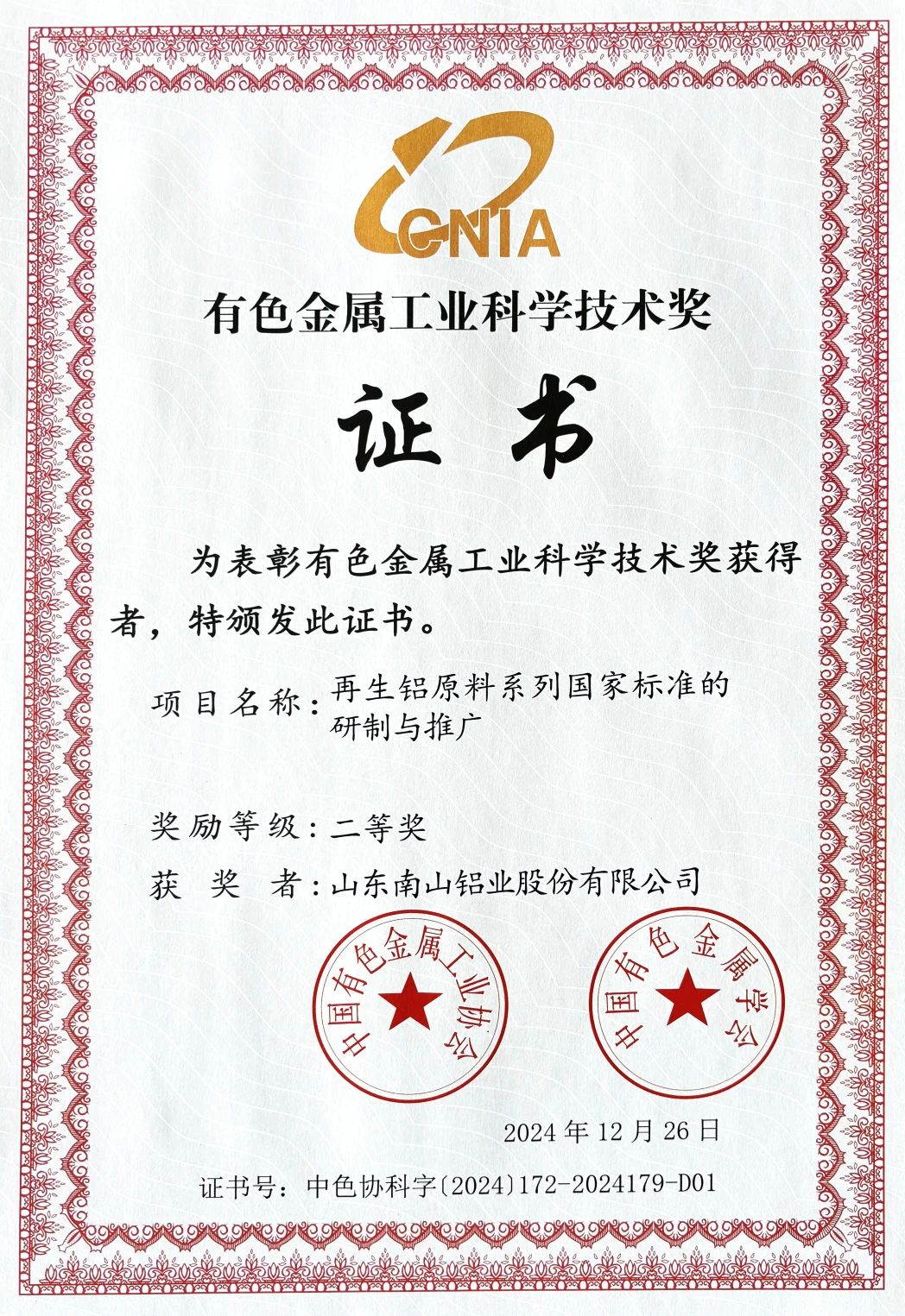 南山鋁業(yè)在再生鋁原料系列國家標準的研制與推廣方面也取得了顯著成果,榮獲二等獎。